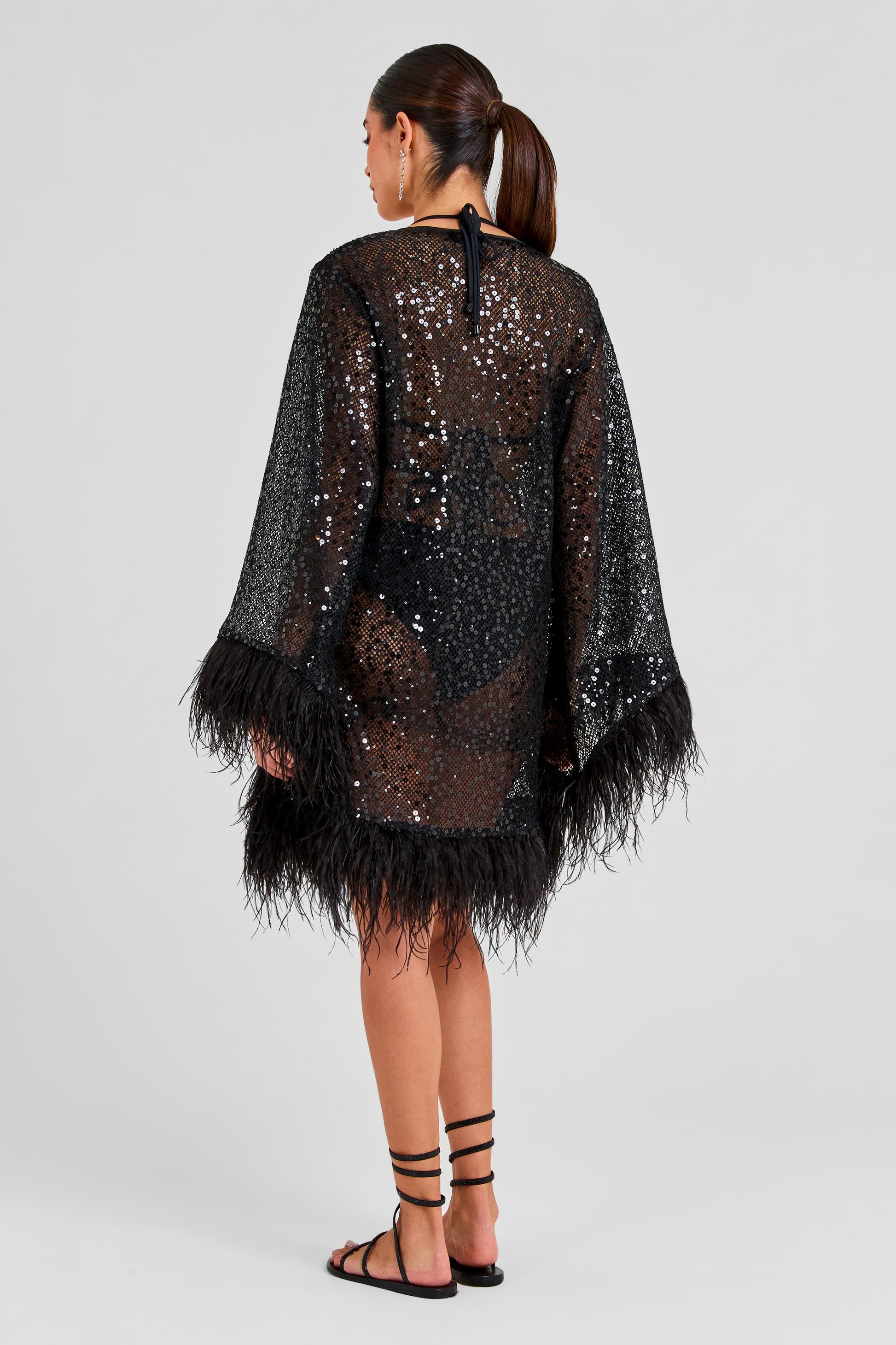 AMBER is a shimmering sheer sequin loose-fit kaftan designed to be worn both open and closed. This flowing beachside style is crafted from black sequin net fabric, featuring exaggerated sleeves adorned with feather detailing at the cuffs. The satin ties with black bead detailing and feather trims add a touch of elegance, while black feather detailing along the hem enhances the luxurious look. For added comfort this style is finished with satin binding.