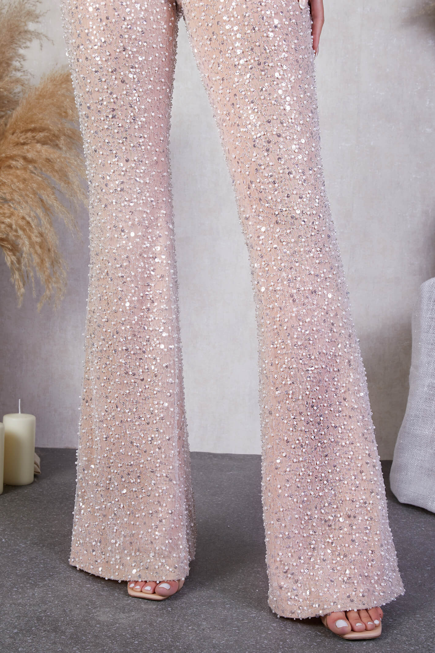 This hand embellished sequin jumpsuit is a perfect piece for occasions, from bridal parties to dinner dates.The contrast lining highlights the beautiful detail within the jumpsuit, finishing the look off with a contrast white belt.
