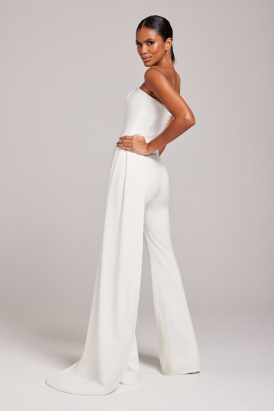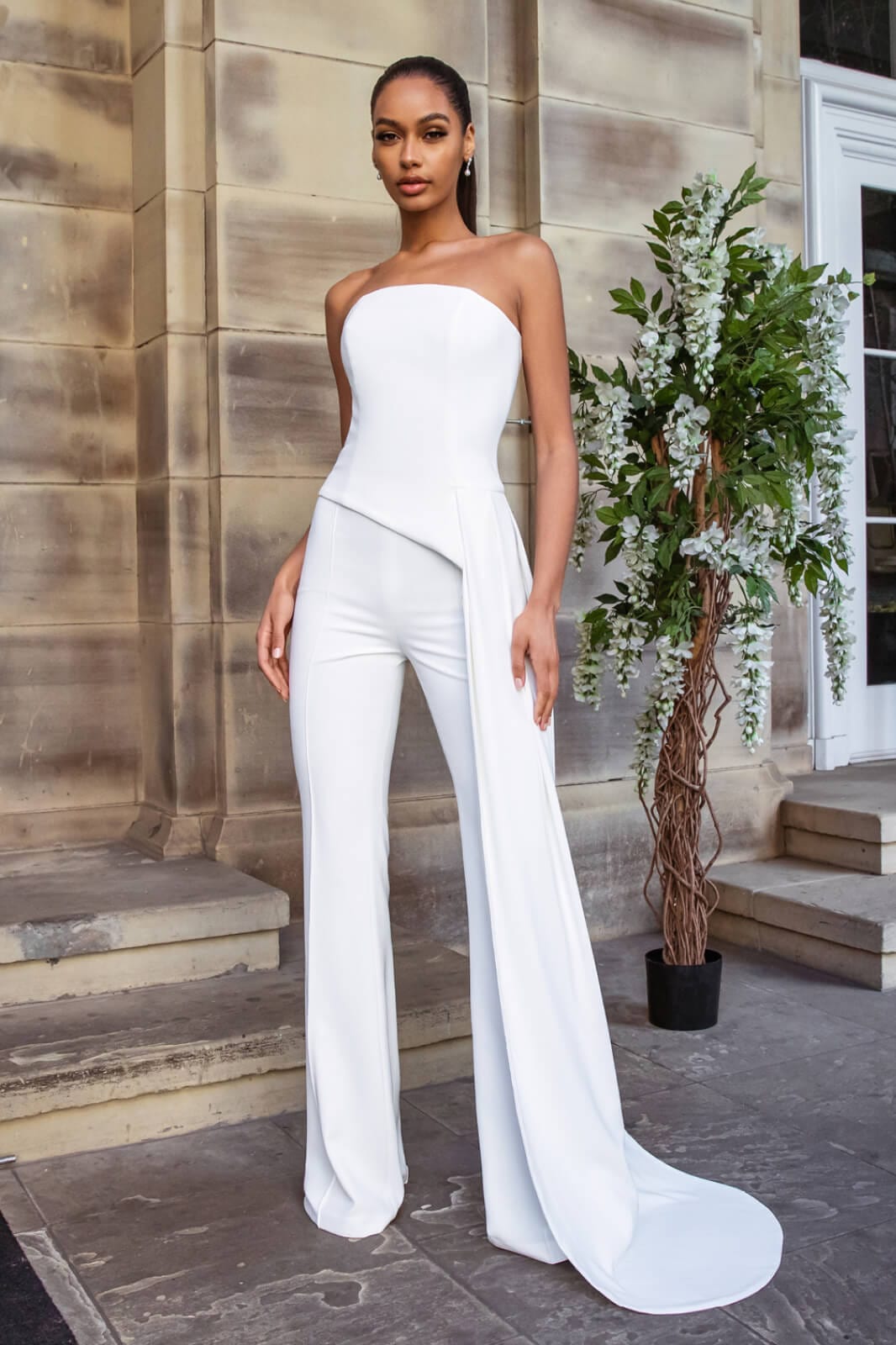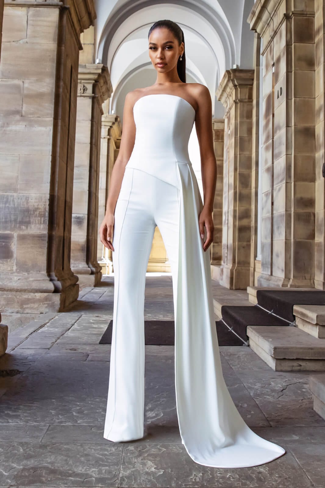 The stunning FAYE White top is a modern bridal boned top with floor-length drape. This top is perfect for dinner dates or engagement shoots, make it elegant and formal with our CHARLOTTE White Trousers, CAMILLE White Trousers or pair with the matching FAYE White Skirt.