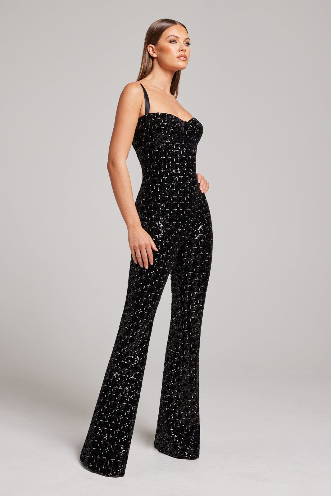 HAILEY is the perfect piece for those daring to make a statement. A figure-hugging jumpsuit complete with a flared trouser. Crafted from shimmering velvet fabric covered in delicate, hand-embroidered sequins and metallic thread embroidery. Complete with an underwire bust to give structure and compliment your shape.