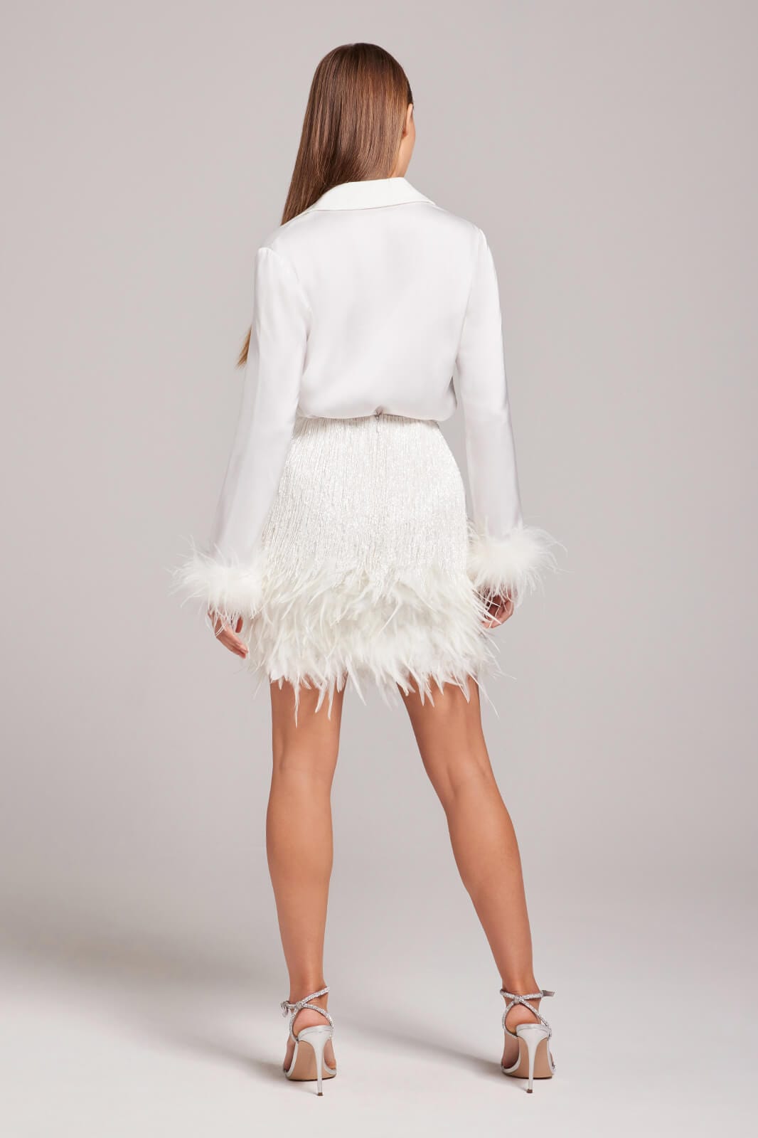Taylor White is the elegant essential you need to elevate any outfit. Made from our exclusive satin and finished with feather trim detailing to the cuff, with diamanté and pearl button detailing.